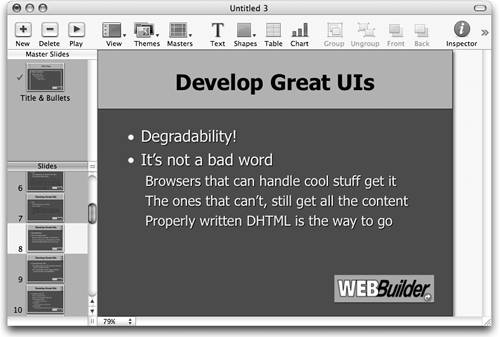 | You can bring PowerPoint files into Keynote in two ways. You can simply open the file, or you can drag the PowerPoint file onto the Keynote application icon. To open PowerPoint files