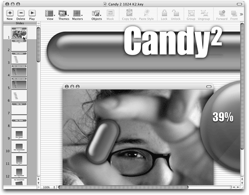 Because the file you are using to create your theme is (until you save it as a theme file) just a regular Keynote file, there is always a "regular" slide in the Slide Navigator under the bar marked "Slides." Set up this first slide as the preview image that will appear in the theme sheet ( Figure 14.28 ). Place the name of your theme on the slide and make it as large as you can since the preview that is built from it will only appear as a 120x90 pixel image in the theme sheet ( Figure 14.29 ).