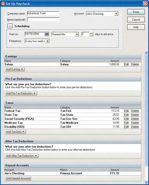 3. Set Up Your PaycheckNow that you've set up your accounts and added categories, it's time to tell Quicken how to handle one of your most important financial transactions: your paycheck. Your paycheck isn't just a simple deposit; it's the amount you are paid (your gross pay ) minus all of those deductions for taxes and other things like 401(k) contributions. You are left with your net pay , which is what gets deposited to your checking account. Your paycheck is an example of a split transaction , which is a transaction that has amounts assigned to more than one category. Your gross pay is a positive number, say $1,000. Each kind of tax (Federal, state, Social Security, etc.) or other payroll deduction is a negative number. The remainder after deductions is your net pay. On Windows, Quicken provides a handy wizard to help with your paycheck setup. On the Mac, you'll enter the different amounts into the register. On both platforms, you can memorize the paycheck and have Quicken automatically enter it for you the next time, so you only have to do the paycheck setup once. |