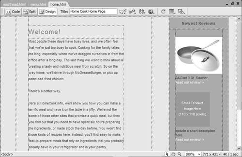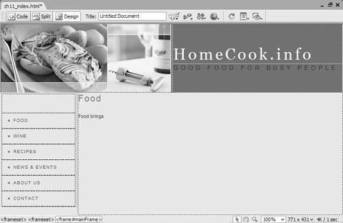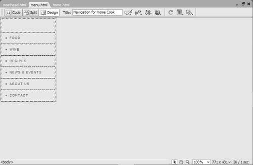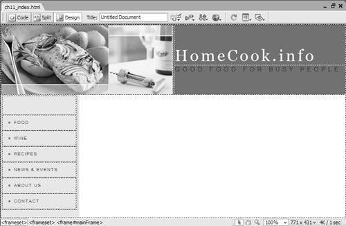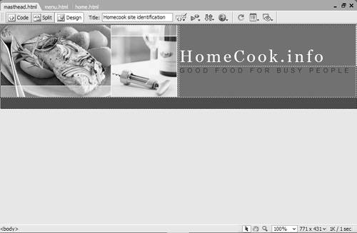 Inserting Pages into FramesNow that you've got your frames set up, you'll need to create pages to fill every frame. These pages are normal Web pages in every way except that they contain just a part of what will appear in the overall window. To prepare the HomeCook. info example, it took four individual pages: masthead.html ( Figure 11.15 ), menu.html ( Figure 11.16 ), home.html ( Figure 11.17 ), and the frameset document. Figure 11.15. This individual HTML page will be placed in the topFrame of the frameset. Figure 11.16. This individual HTML page will be placed in the leftFrame of the frameset. Figure 11.17. This individual HTML page will be placed in the mainFrame of the frameset. To add a prepared page to a frame:
