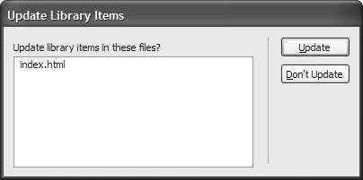 | You need to be a bit careful when you edit Library items, because when you change a Library item, Dreamweaver changes all instances of that item throughout all the pages of your site, in any documents that are not currently being edited. This can take some time if you have a large site, and you have to edit the item again to undo a mistake; the Undo command won't save you in this case. It's nothing to worry about; just be aware that changes can have far-reaching effects. To edit a Library item: