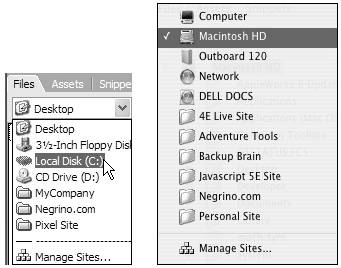 | The Browse pop-up menu at the top of the Files panel allows you to browse through your hard disk, and easily switch between sites that you have defined. The menu looks a bit different on Windows and Mac, reflecting the differences between the operating systems ( Figure 2.14 ). On both platforms, sites you have defined appear in the menu as folders. Figure 2.14. The Browse menu in the Files panel reflects the differences in the Windows (left) and Mac (right) operating systems. To browse your hard disk: